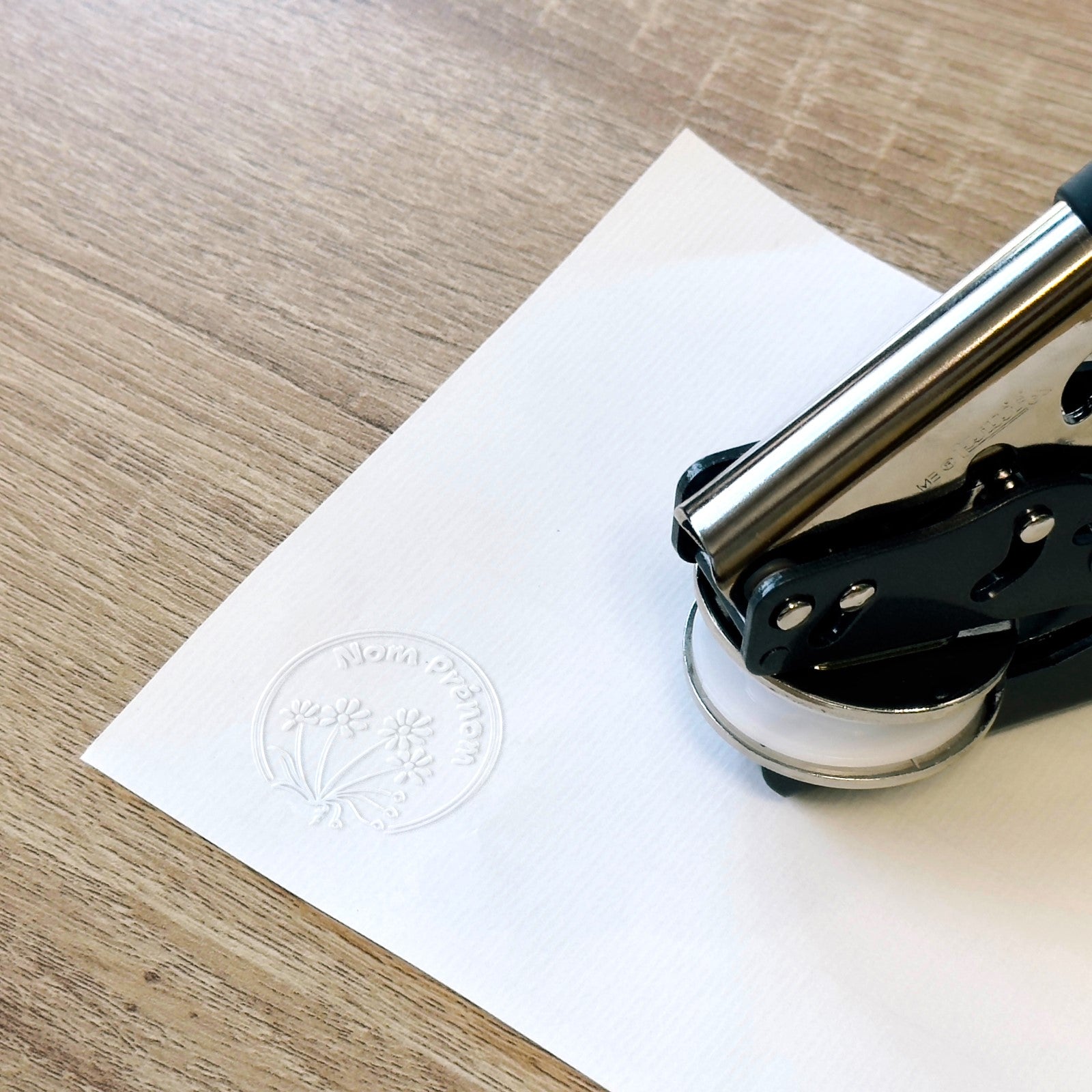 Stellen Sie sich vor, Sie verschönern Ihre Verwaltungsdokumente, Einladungen oder Grußkarten mit einer einzigartigen und gepflegten Note dank unseres Prägestempel-Modells mit dem Titel: Eingekreiste Blumen. Mit diesem Modell können Sie Ihre Unterlagen personalisieren, indem Sie ihnen eine unverwechselbare und raffinierte Marke hinzufügen. Dieses Modell zeigt einen Strauß aus drei Blumen, umgeben von dekorativen Kreisen, mit der Möglichkeit, Ihren eigenen personalisierten Text in der Mitte hinzuzufügen.