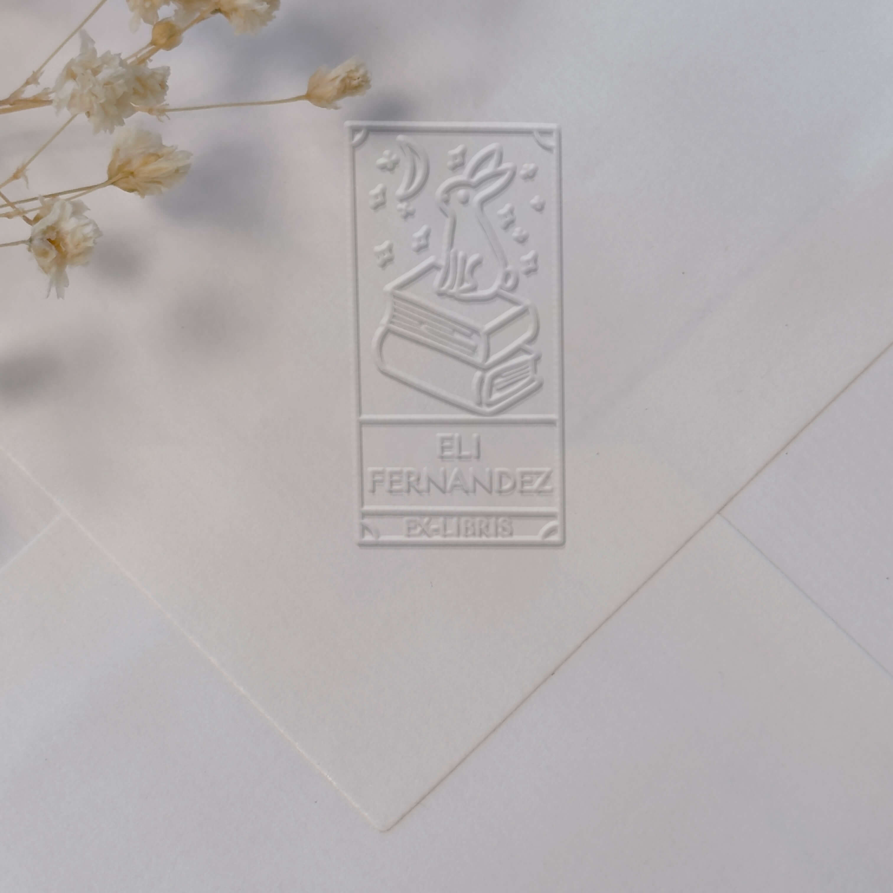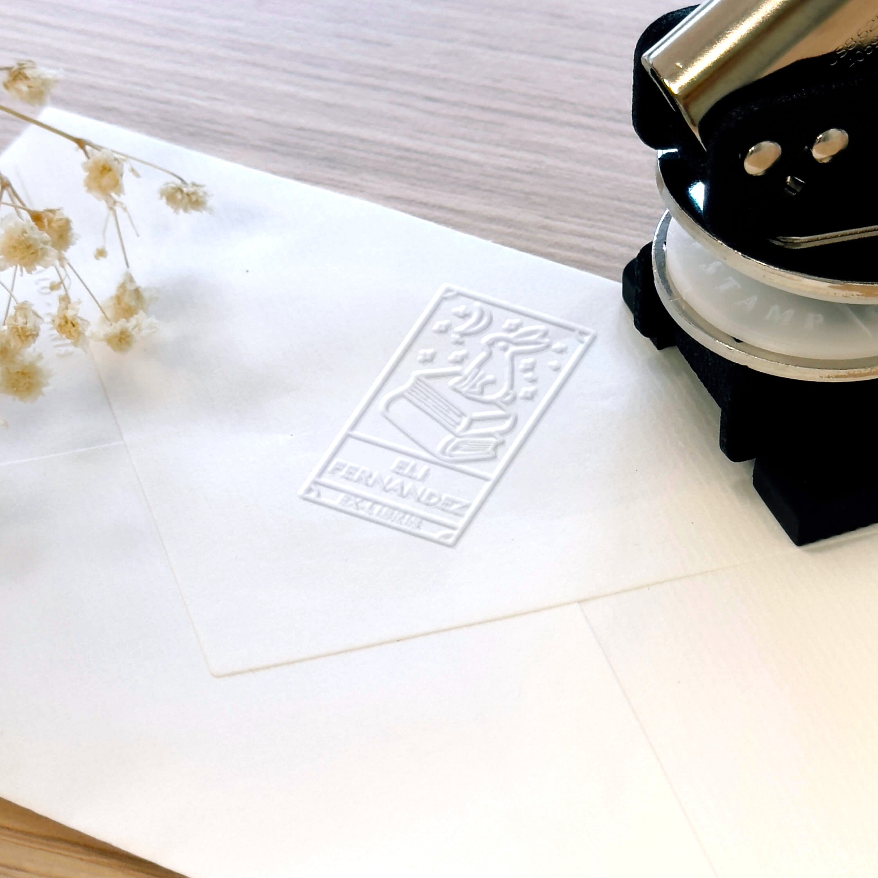 Erstellen Sie ein personalisiertes Exlibris mit diesem charmanten Motiv eines Hasen, der auf seinen Büchern unter einem Sternenhimmel sitzt, perfekt, um Ihre Werke mit einer eleganten Prägung zu markieren.