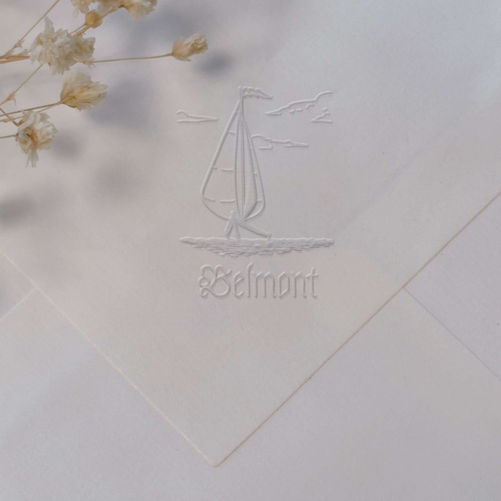Erstellen Sie ein elegantes Ex-libris mit diesem Modell, das ein stilisiertes Segelboot unter den Wolken zeigt, perfekt, um Ihre Bücher mit Ihrem Namen zu personalisieren.