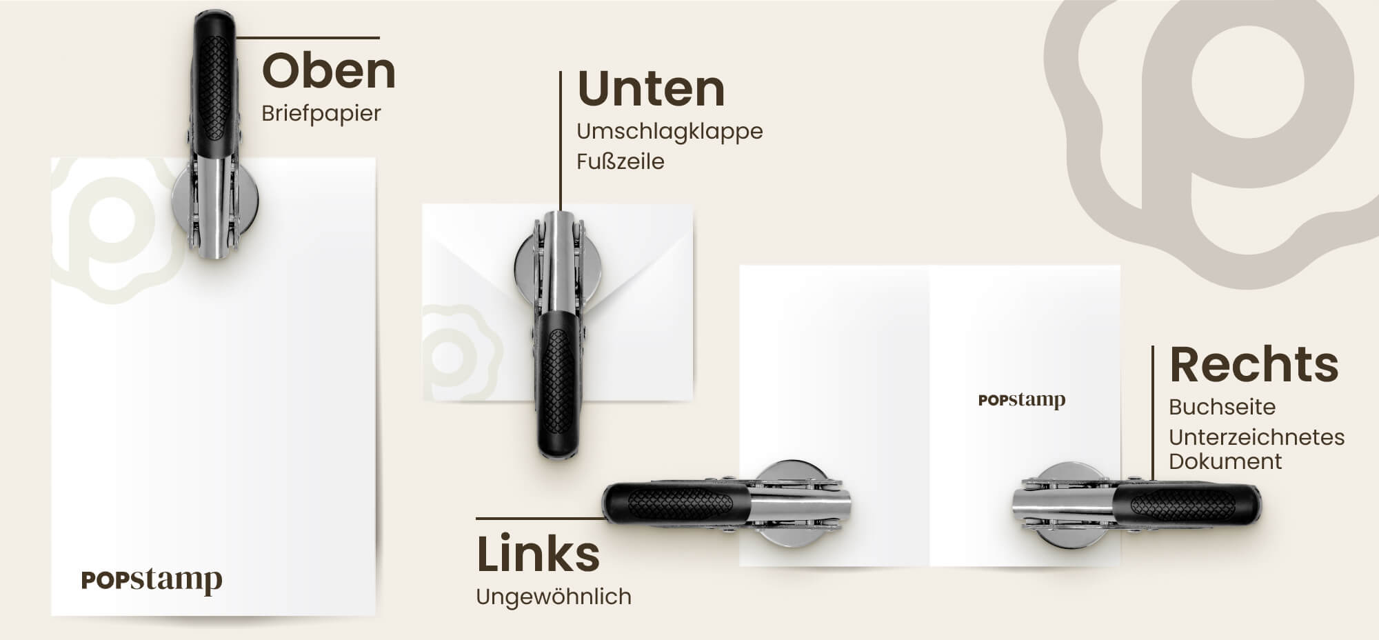 Deshalb ist es sehr wichtig, dass Sie die Nutzung Ihrer Presse sorgfältig auswählen. Für Bücher wird meist eine Positionierung unten oder rechts verwendet. Für einen Briefumschlag empfiehlt sich eher unten, um das Motiv auf die Lasche zu prägen.