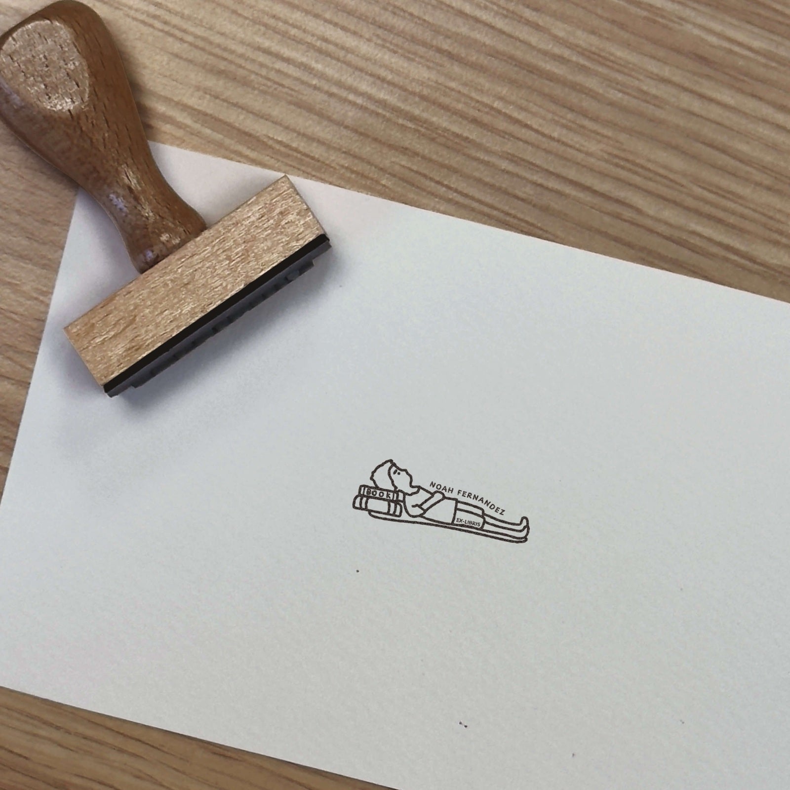 Transformez vos livres en véritables trésors personnalisés avec ce tampon ex libris illustrant une scène de lecture paisible.