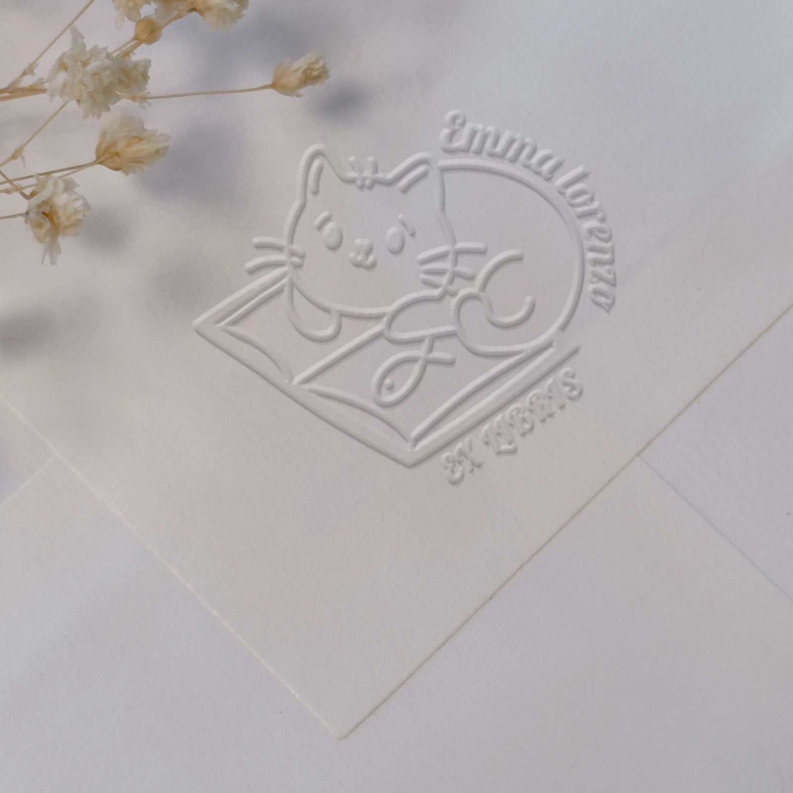 Verwandeln Sie Ihre Bücher in exklusives Eigentum mit diesem Prägezangenmodell, das eine entzückende Katze zeigt, die auf einem offenen Buch liegt, begleitet von dem Text „EX LIBRIS“ und Ihrem anpassbaren Namen.