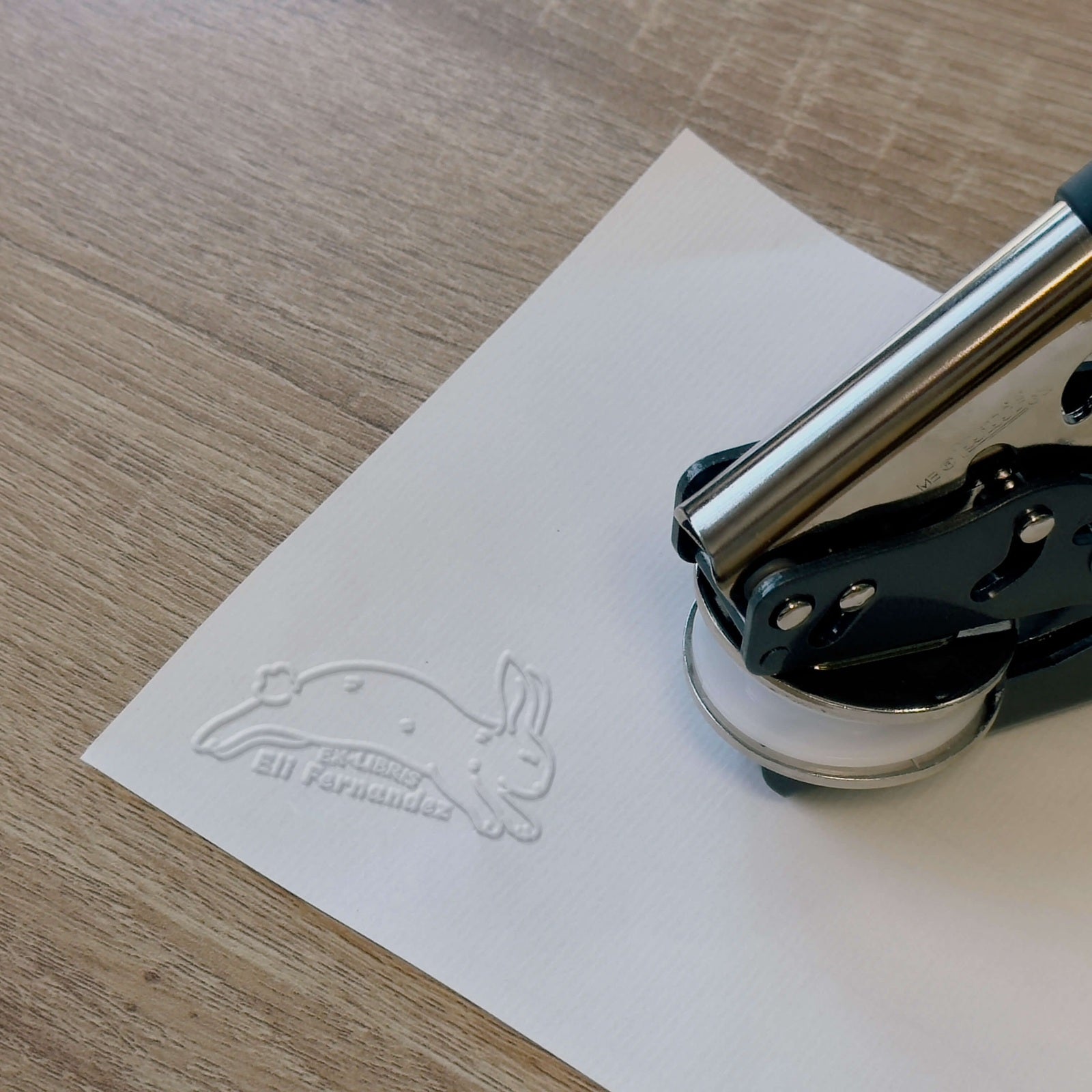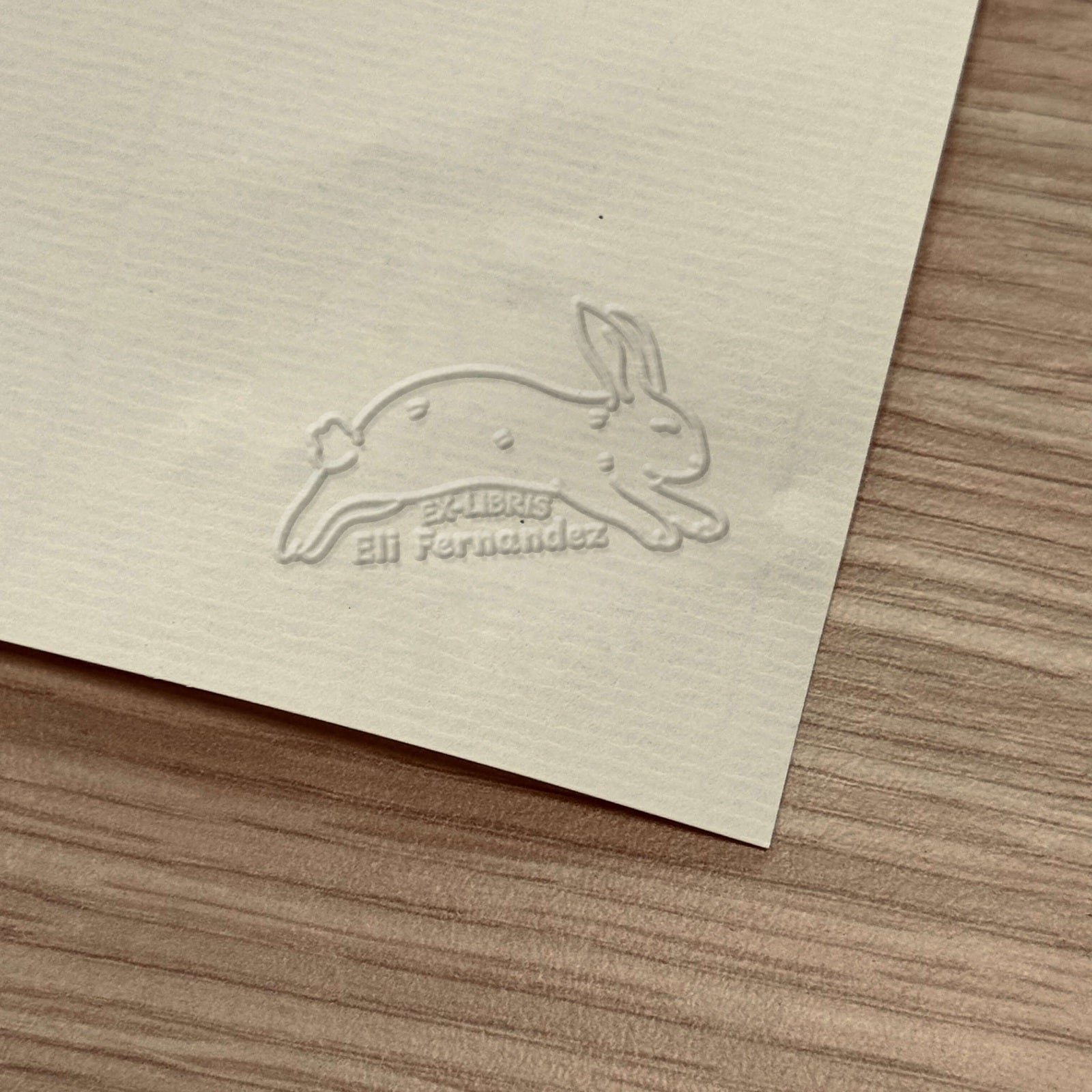 Verwandeln Sie Ihre Bücher mit diesem Ex-libris-Modell mit springendem Hasenmotiv, entworfen für Ihre Prägezange und personalisierbar mit Ihrem Namen.