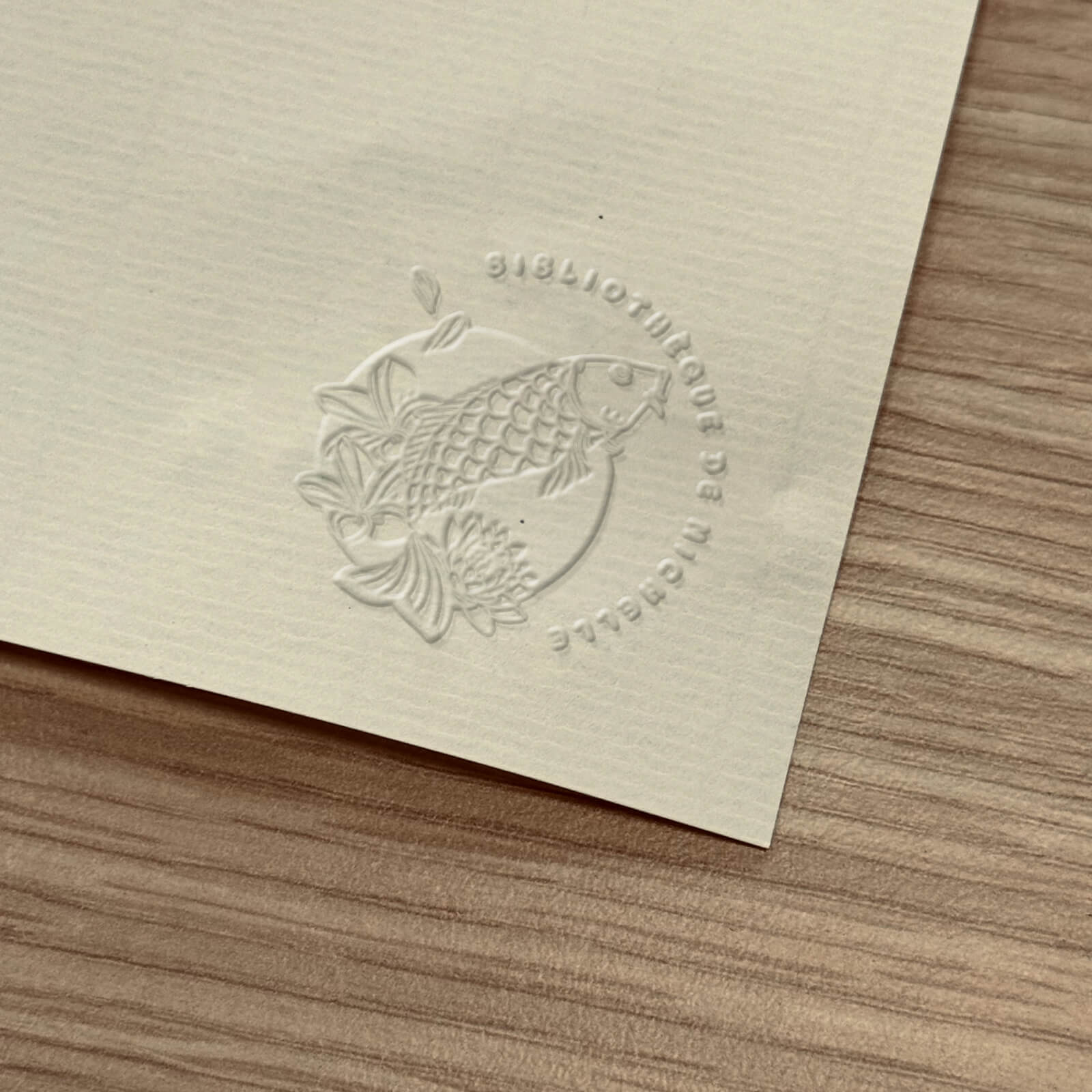 Stellen Sie sich vor, Sie markieren Ihre Bücher, Kunstwerke oder persönlichen Dokumente mit einer einzigartigen und künstlerischen Note dank unseres Prägestempel-Modells mit dem Titel: Ex-libris Japanischer Fisch. Dieses Modell ermöglicht es Ihnen, eine raffinierte und anpassbare Signatur zu Ihren wertvollsten Besitztümern hinzuzufügen. Der Prägestempel zeigt einen japanischen Fisch, der zart durch stilisierte Wellen schwimmt, umgeben von anpassbarem Text.