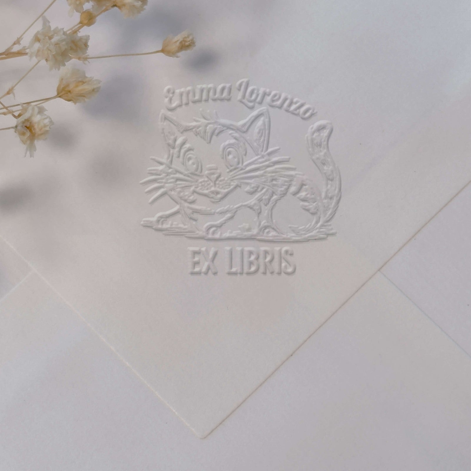 Erstellen Sie Ihr personalisiertes Ex-libris mit diesem Modell einer getigerten Katze im raffinierten Zeichnungsstil, perfekt, um Ihre Bücher mit einer einzigartigen und eleganten Prägung zu versehen.