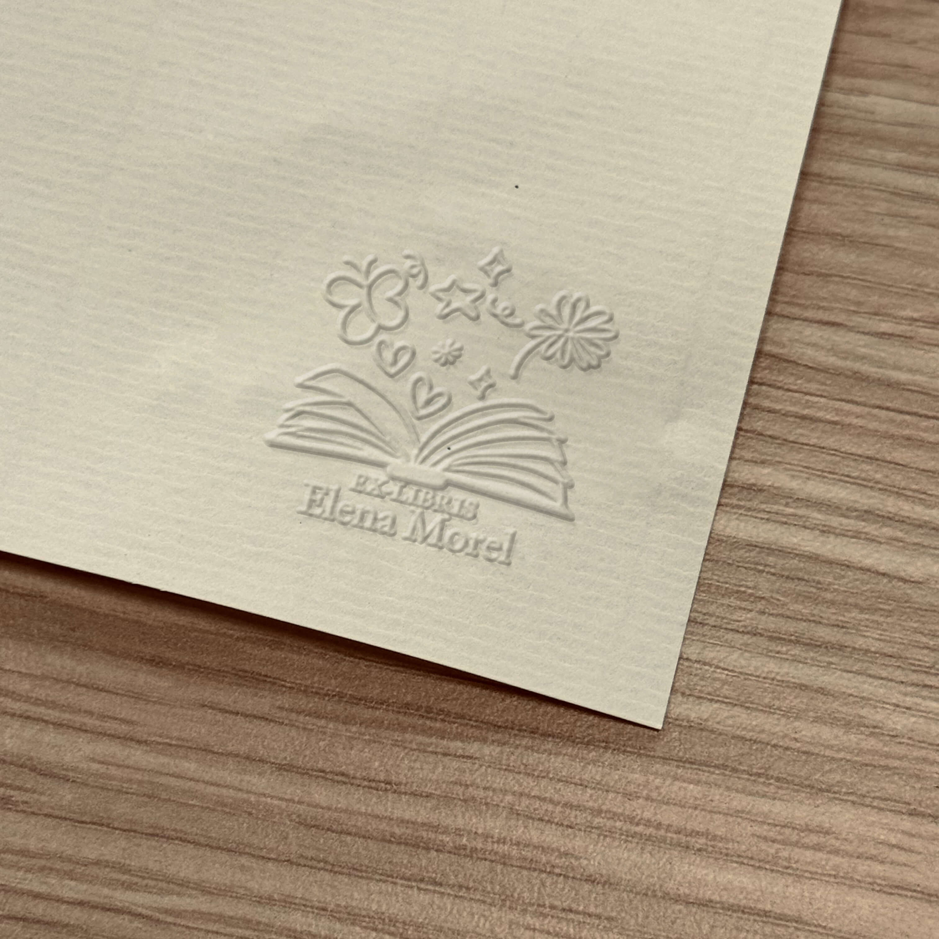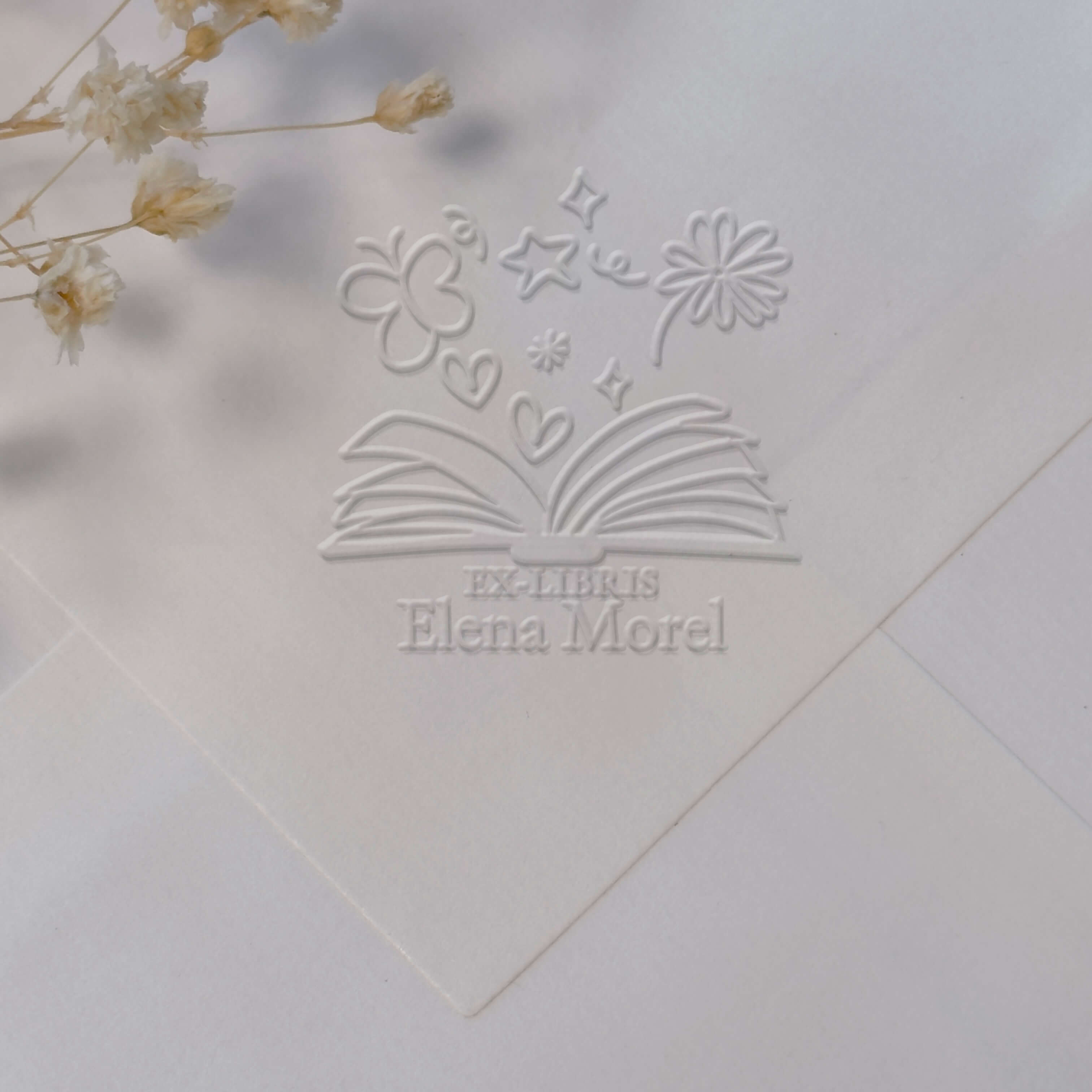 Personnalisez vos livres avec élégance grâce à ce modèle d'ex-libris au design enchanteur, mettant en scène un livre ouvert d'où s'échappent papillons, étoiles et motifs féeriques.