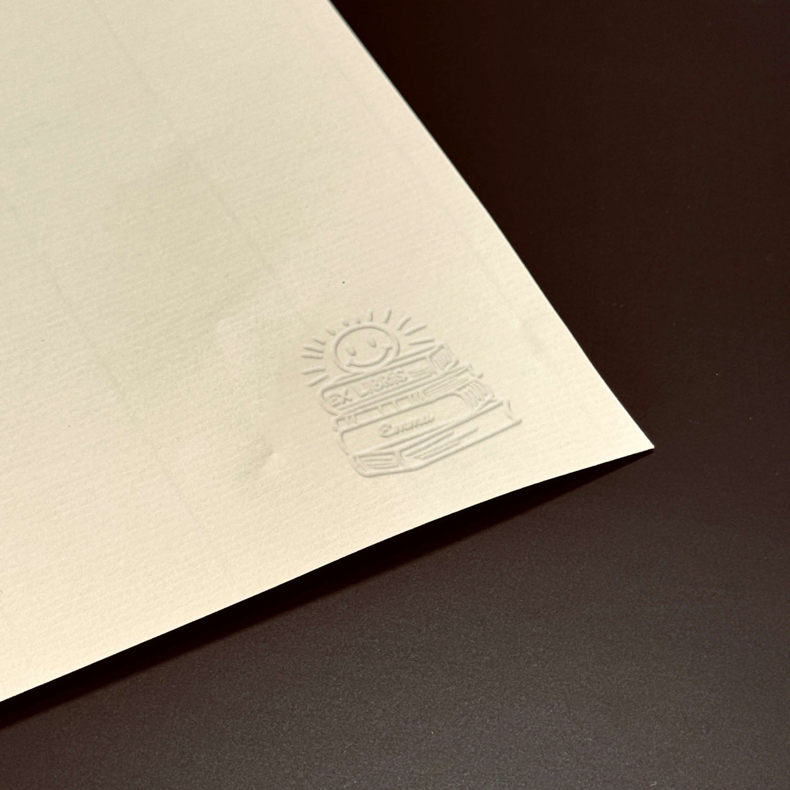 Personalisieren Sie Ihre Bücher mit diesem einzigartigen Ex-libris-Modell, das einen Stapel Bücher mit einer strahlenden, lächelnden Sonne kombiniert.