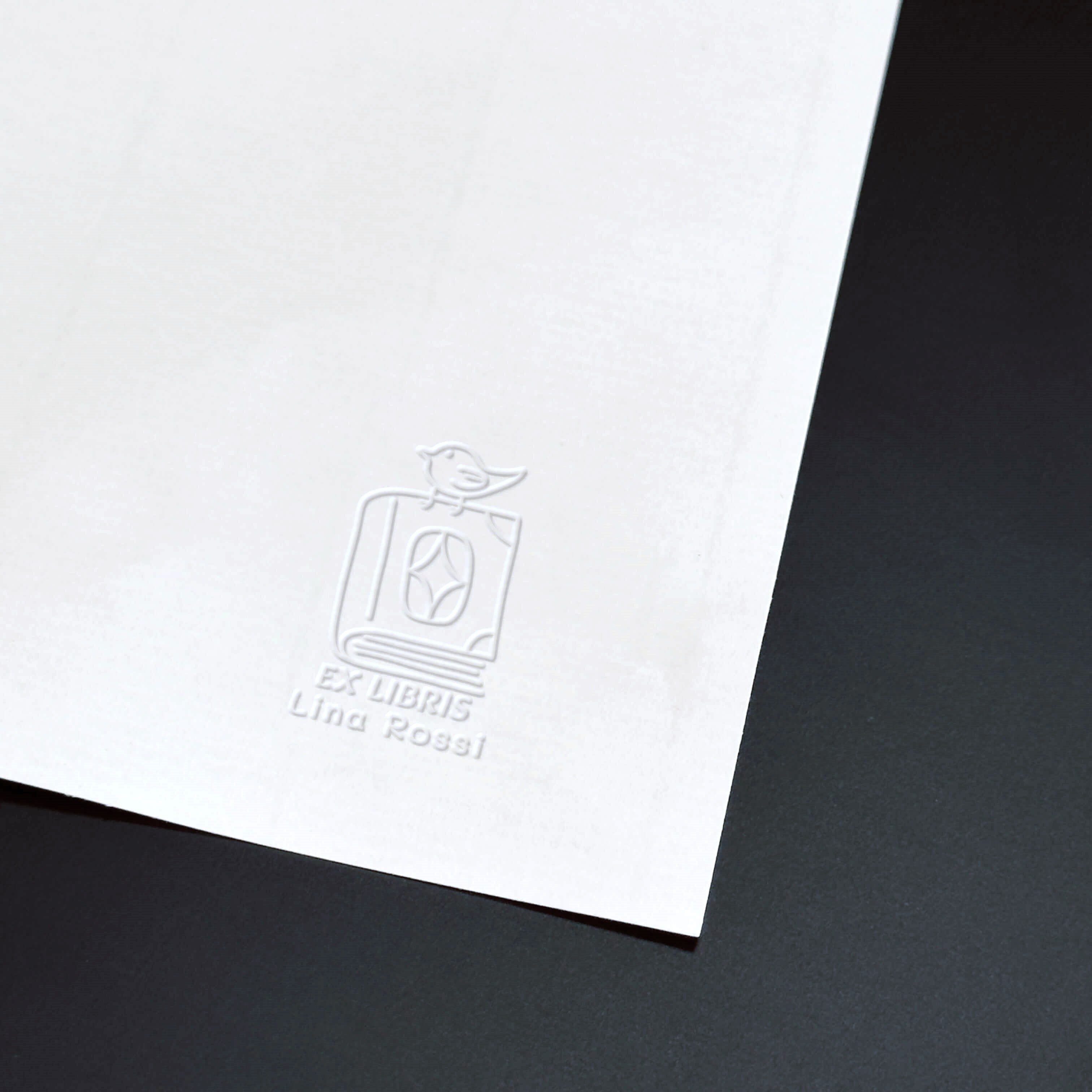 Erstellen Sie Ihr personalisiertes Exlibris mit dieser minimalistischen Illustration eines Vogels, der auf einem offenen Buch sitzt, durch Prägestempel auf Ihren Büchern graviert.