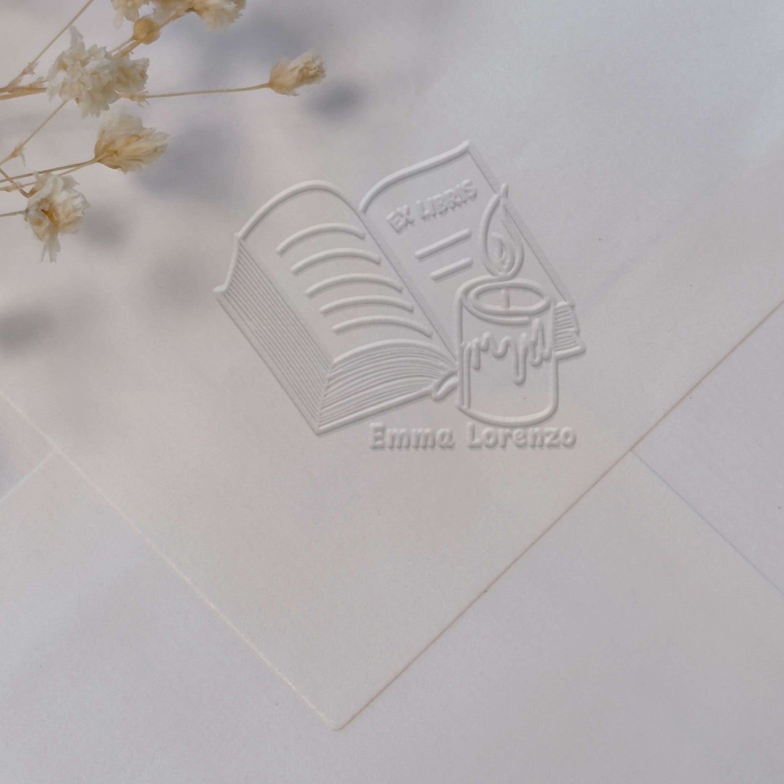Erstellen Sie Ihr persönliches Ex-libris mit diesem authentischen Motiv, das ein geöffnetes Buch beleuchtet von einer Kerze darstellt, perfekt um Ihre Werke mit einer raffinierten Prägung zu kennzeichnen.