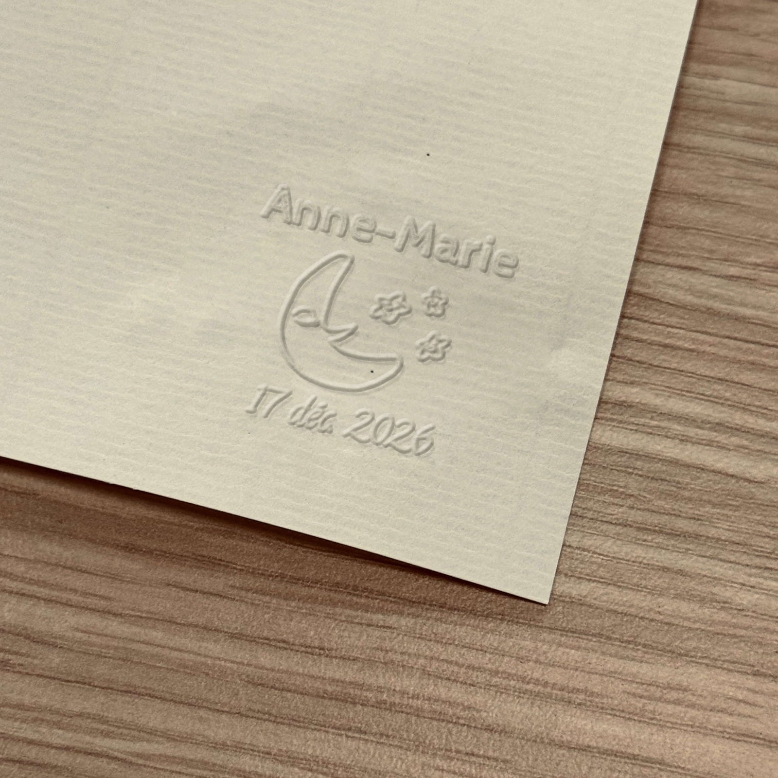 Verewigen Sie die Geburt Ihres kleinen Schatzes mit dieser Prägezange im Motiv des friedlichen Mondes, die Sanftheit und Personalisierung für Ihre wertvollsten Kreationen vereint.