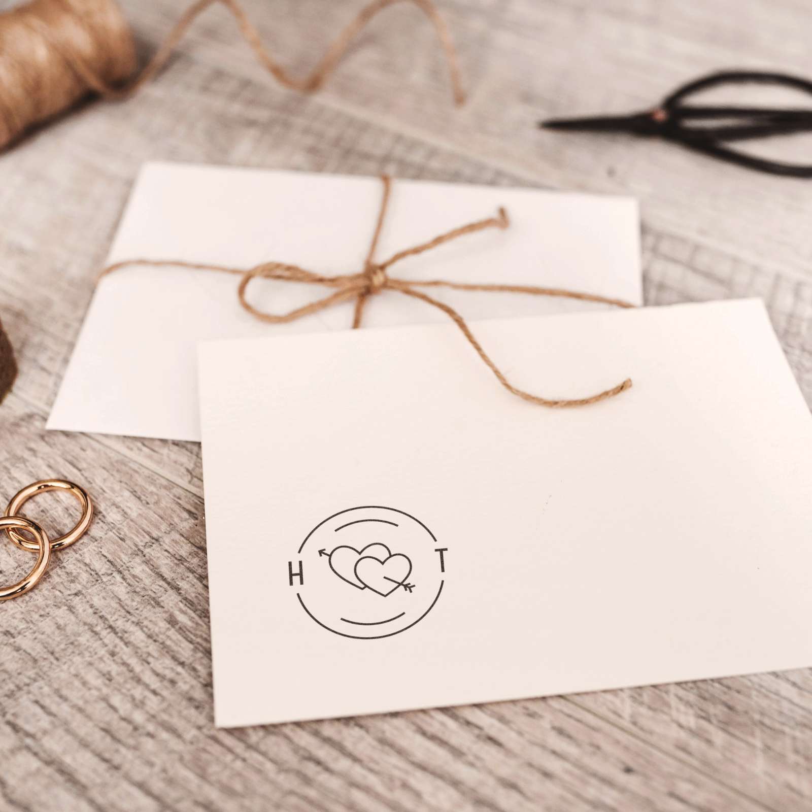 Dieses runde Modell mit zwei ineinander verschlungenen Herzen, die von einem Pfeil durchzogen sind, symbolisiert perfekt die Liebesvereinigung für Ihre personalisierten Hochzeitskreationen.