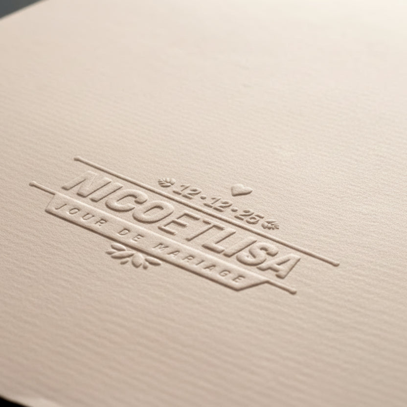 Um Ihren besonderen Tag zu feiern, was gibt es Besseres, als Ihren Hochzeitspapieren mit unserem Prägestempel-Modell 'Prägestempel Hochzeitstag' eine unverwechselbare Note zu verleihen. Dieses Werkzeug ermöglicht es Ihnen, Ihre Einladungen, Menüs oder Dankeskarten mit gepflegter Diskretion zu personalisieren. Das Design zeigt zwei ineinander verschlungene Ringe, umgeben von kleinen Sternen und personalisierbarem Text, den Sie mit Ihren Namen und dem Datum einzigartig gestalten können.