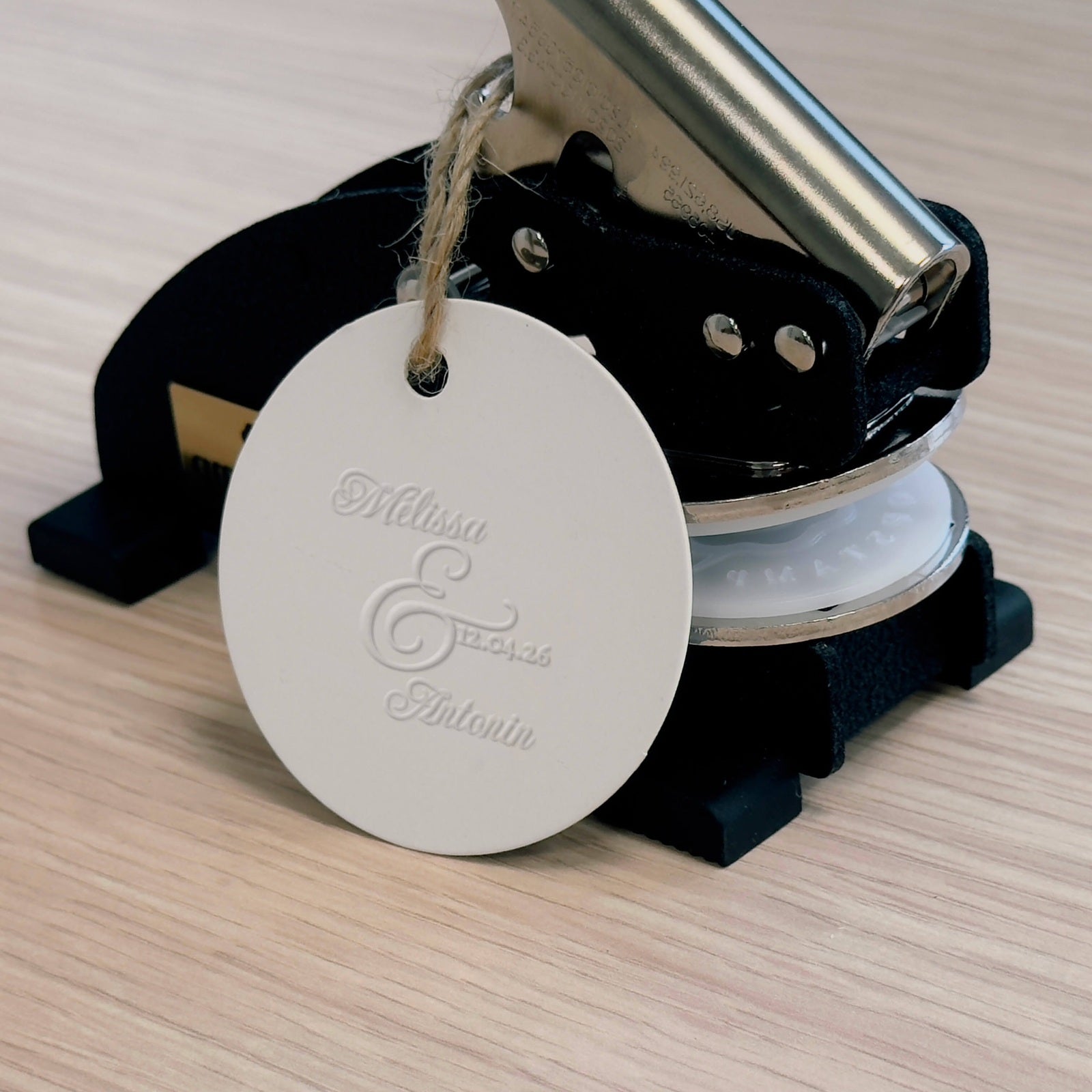Erstellen Sie elegante Prägungen mit diesem Modell einer Prägezange, verziert mit einem wunderschönen kalligrafierten Et-Zeichen und Ihren personalisierten Vornamen.