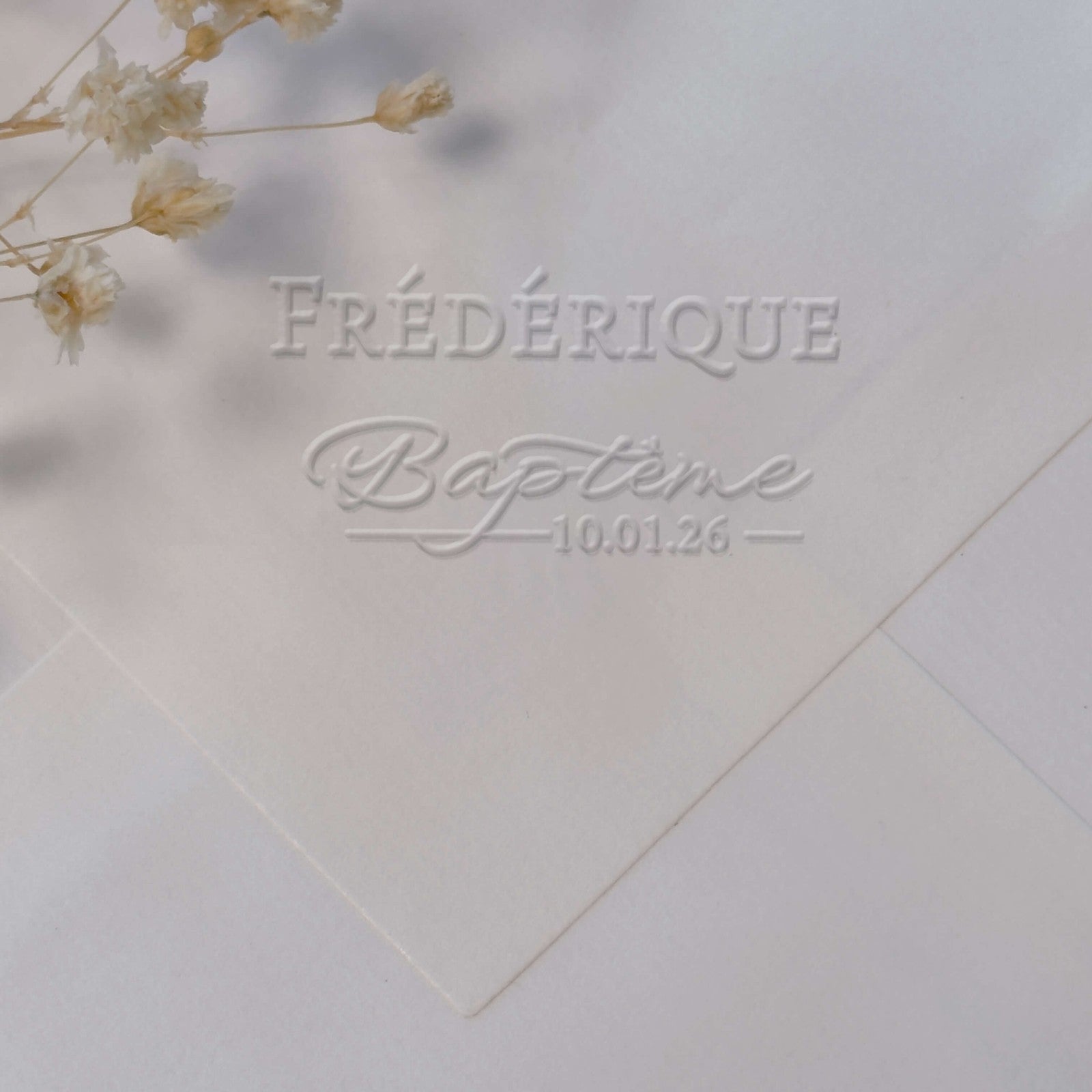 Personalisieren Sie Ihre Taufeinladungen mit dieser Prägezange im raffinierten typografischen Design, das Skript-Kalligraphie und Serifenschrift in einem horizontalen rechteckigen Format vereint.