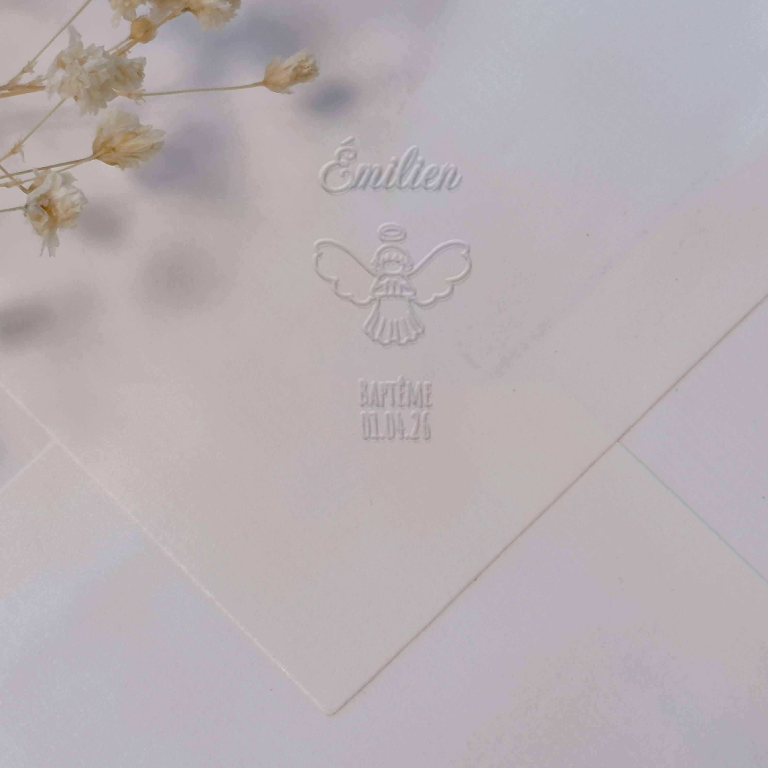 Erstellen Sie eine einzigartige Prägung zur Feier der Taufe mit diesem anpassbaren Modell, das ein betendes Kind als Engel darstellt.