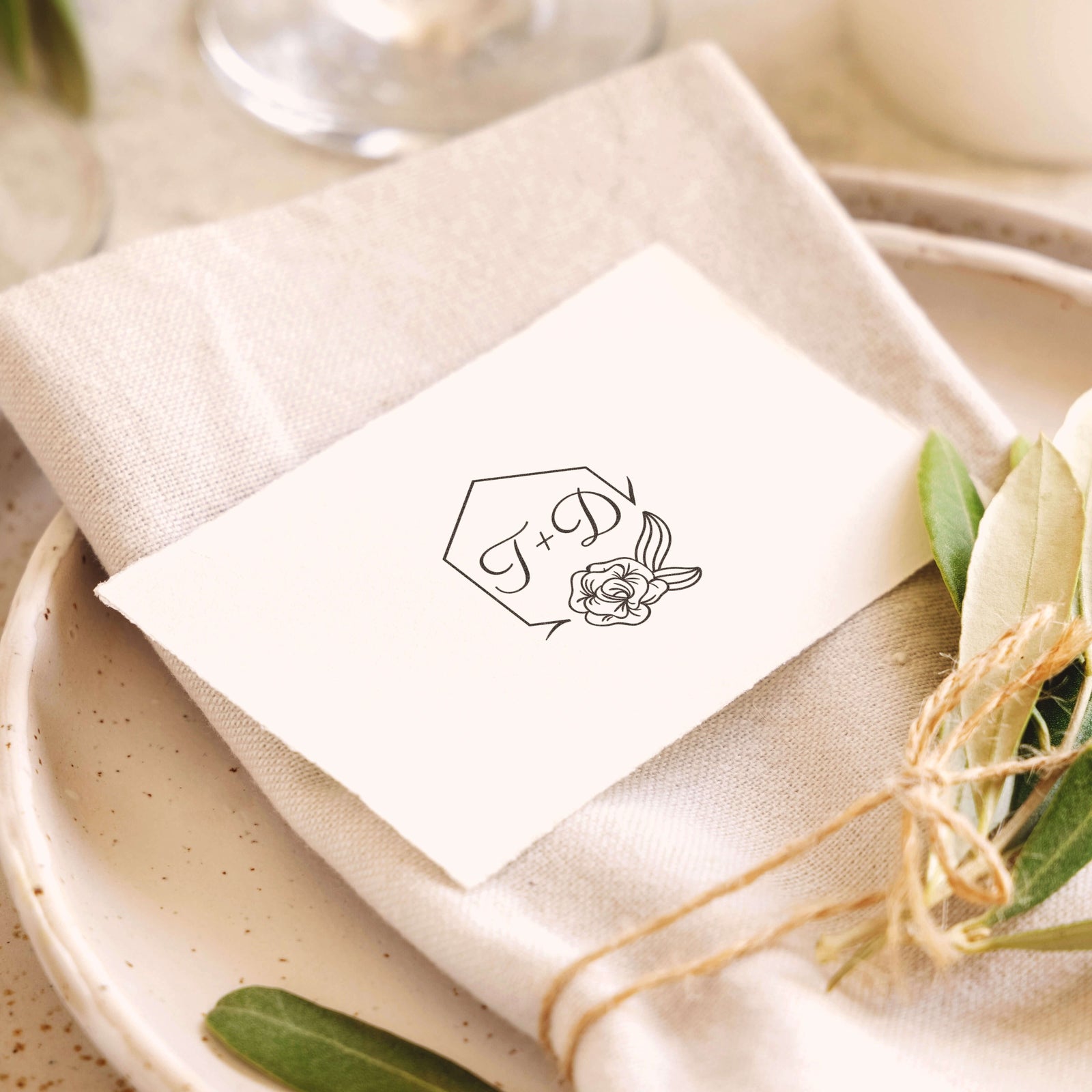 Feiern Sie Ihre Verbindung mit diesem eleganten hexagonalen Stempel, verziert mit einer stilisierten Blume und einer raffinierten Kalligraphie für Ihre Vornamen, die durch ein Pluszeichen verbunden sind.