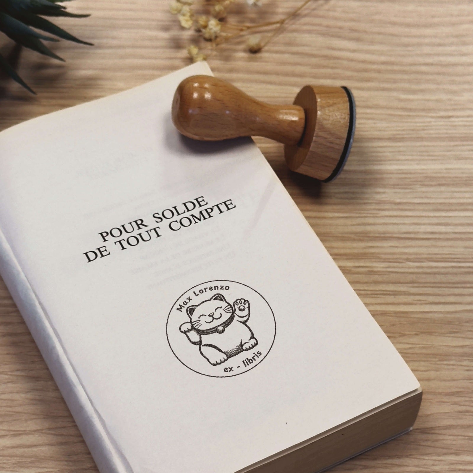 Personalisieren Sie Ihre Bücher mit diesem charmanten Ex-libris-Stempel Maneki-neko, der berühmten japanischen Glückskatze, die Ihrem persönlichen Bücherregal Wohlstand und Schutz bringt.