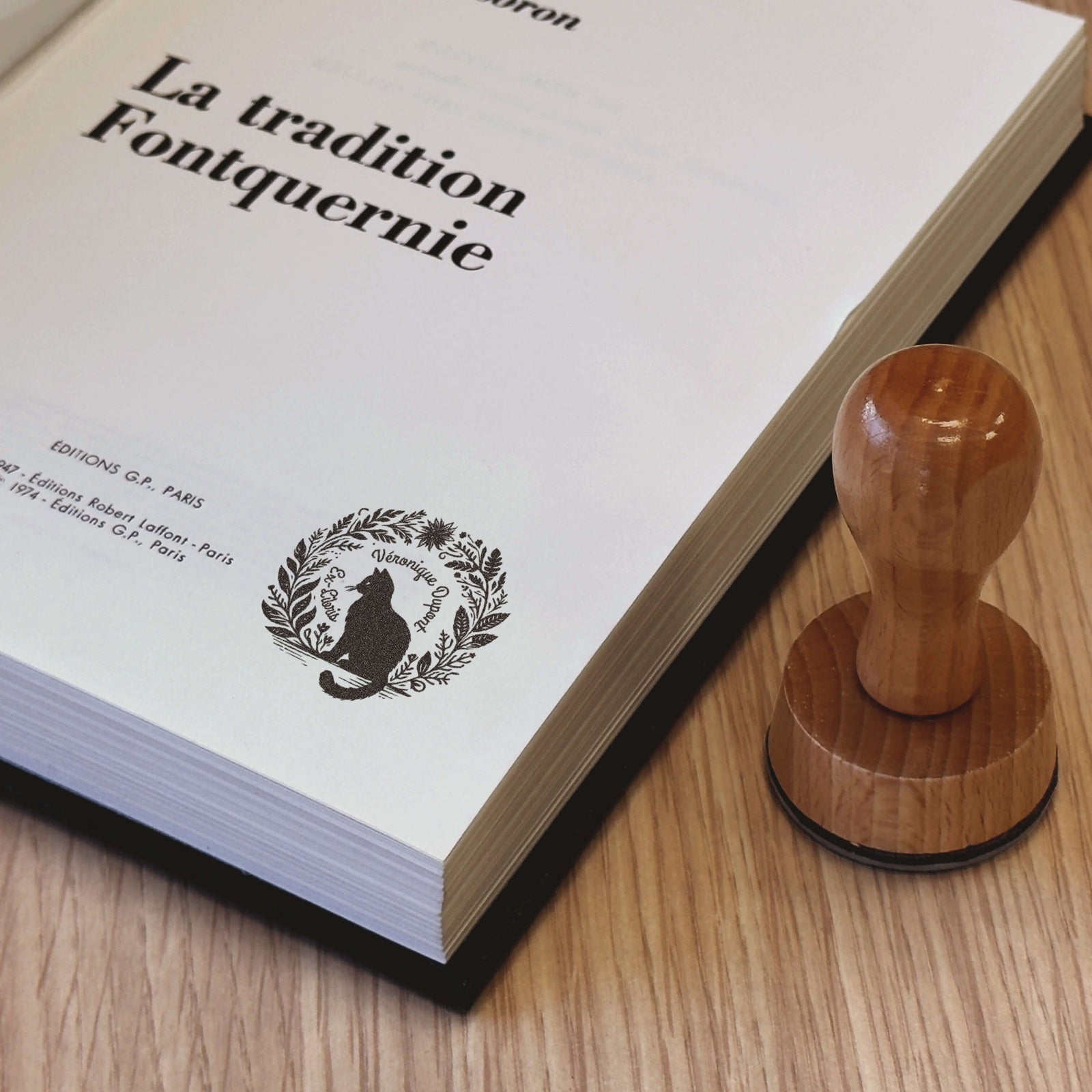 Erstellen Sie Ihre persönliche literarische Signatur mit diesem charmanten Ex-libris Stempel, der eine sitzende Katze in einer Pflanzenkrone darstellt.