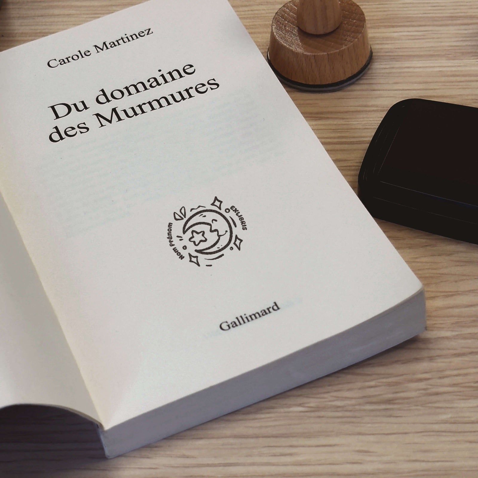 Verwandeln Sie Ihre Bücher in personalisierte Werke mit diesem charmanten Ex-libris-Stempel mit einem lächelnden Mondmotiv, der einen funkelnden Stern hält.