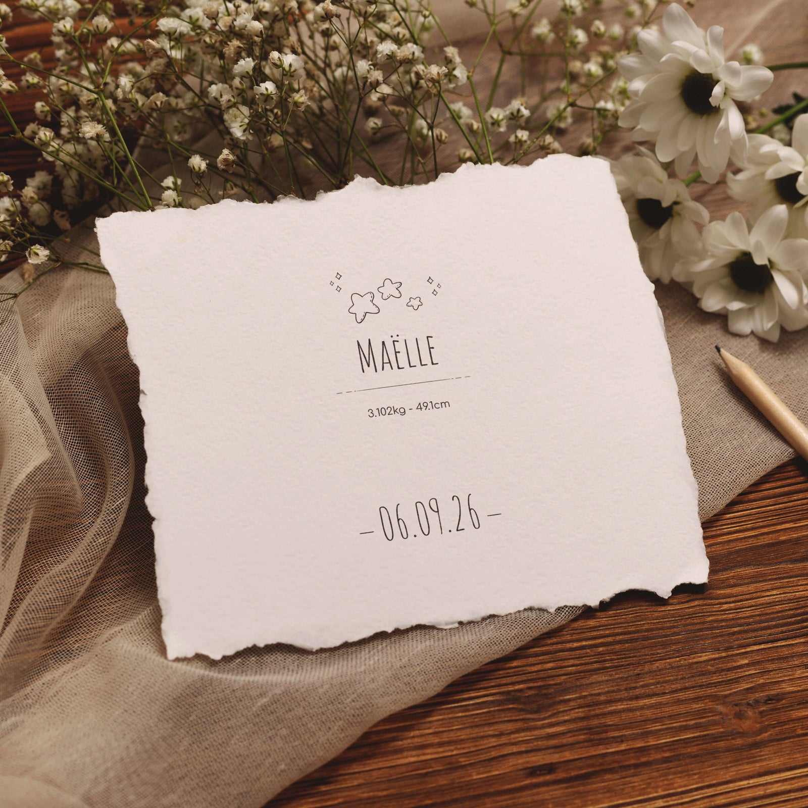 Feiern Sie die Ankunft Ihres kleinen Schatzes mit diesem Holzstempel im Sternenmuster, personalisierbar mit Name, Gewicht, Größe und Geburtsdatum.