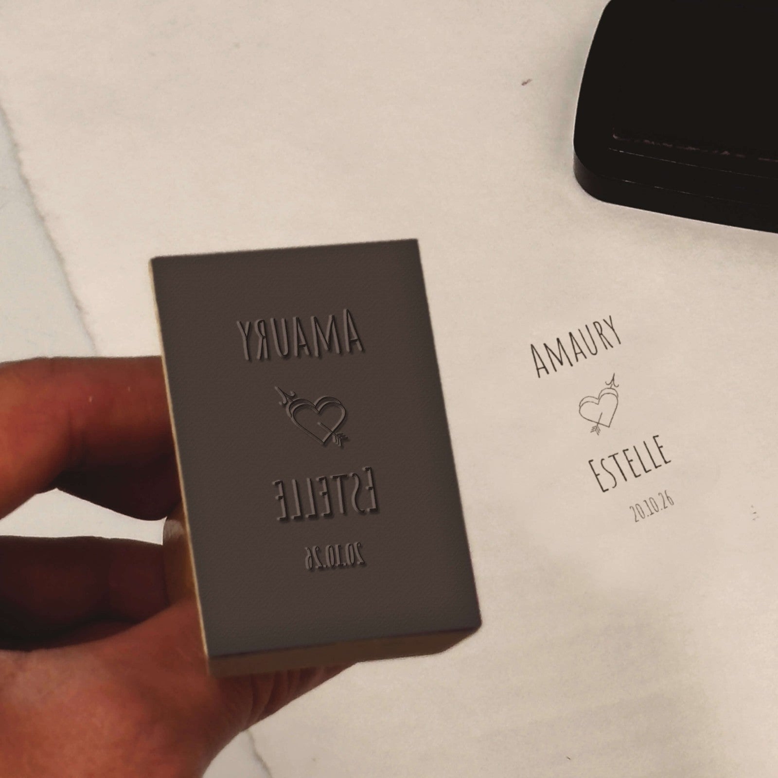 Erstellen Sie Ihren personalisierten Hochzeitsstempel mit diesem romantischen runden Modell, perfekt, um Ihre Verbindung mit Eleganz und Originalität zu verewigen.