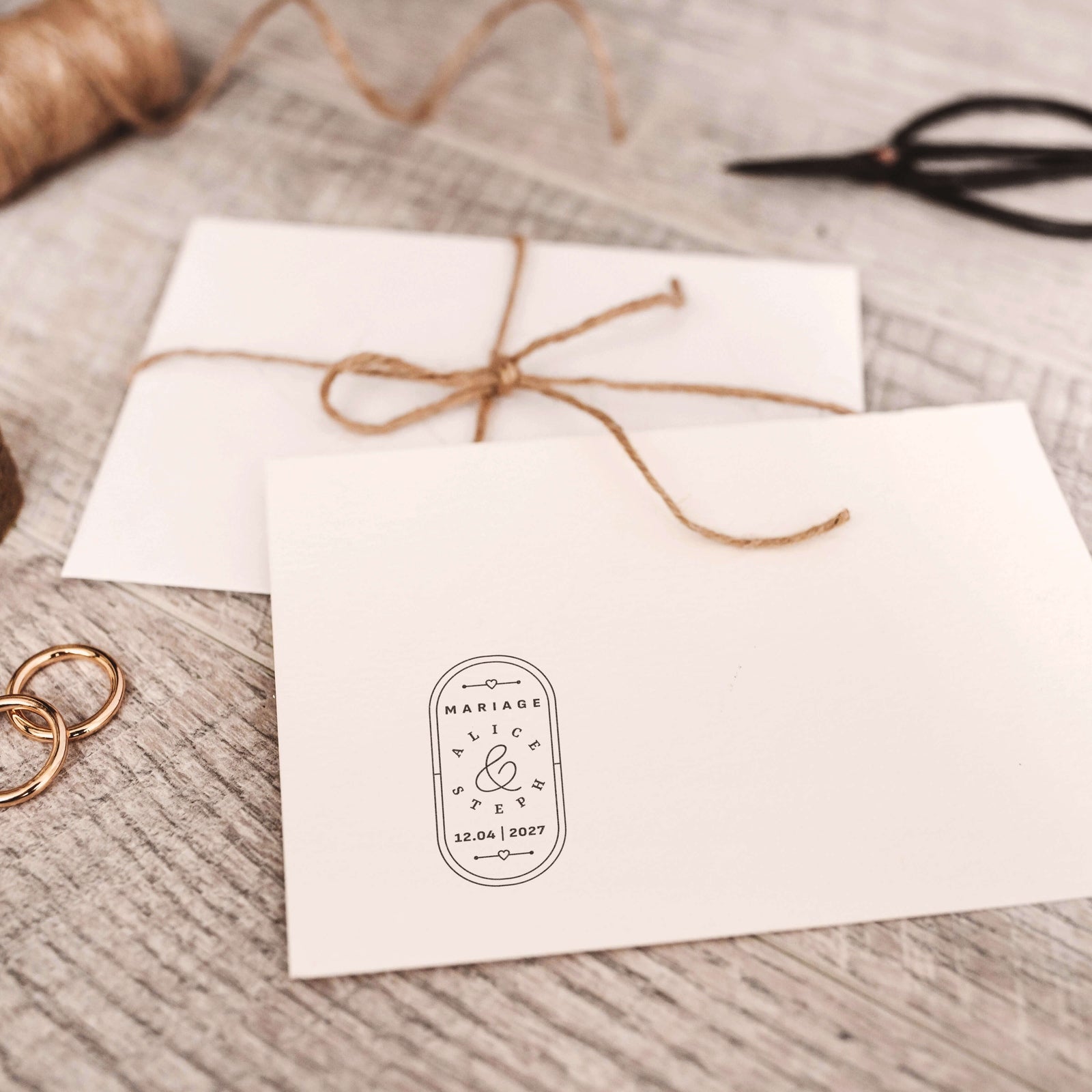 Verewigen Sie Ihre Verbindung mit diesem Hochzeitsstempel mit klaren Linien, perfekt zum Personalisieren Ihrer Einladungen und Ankündigungen.