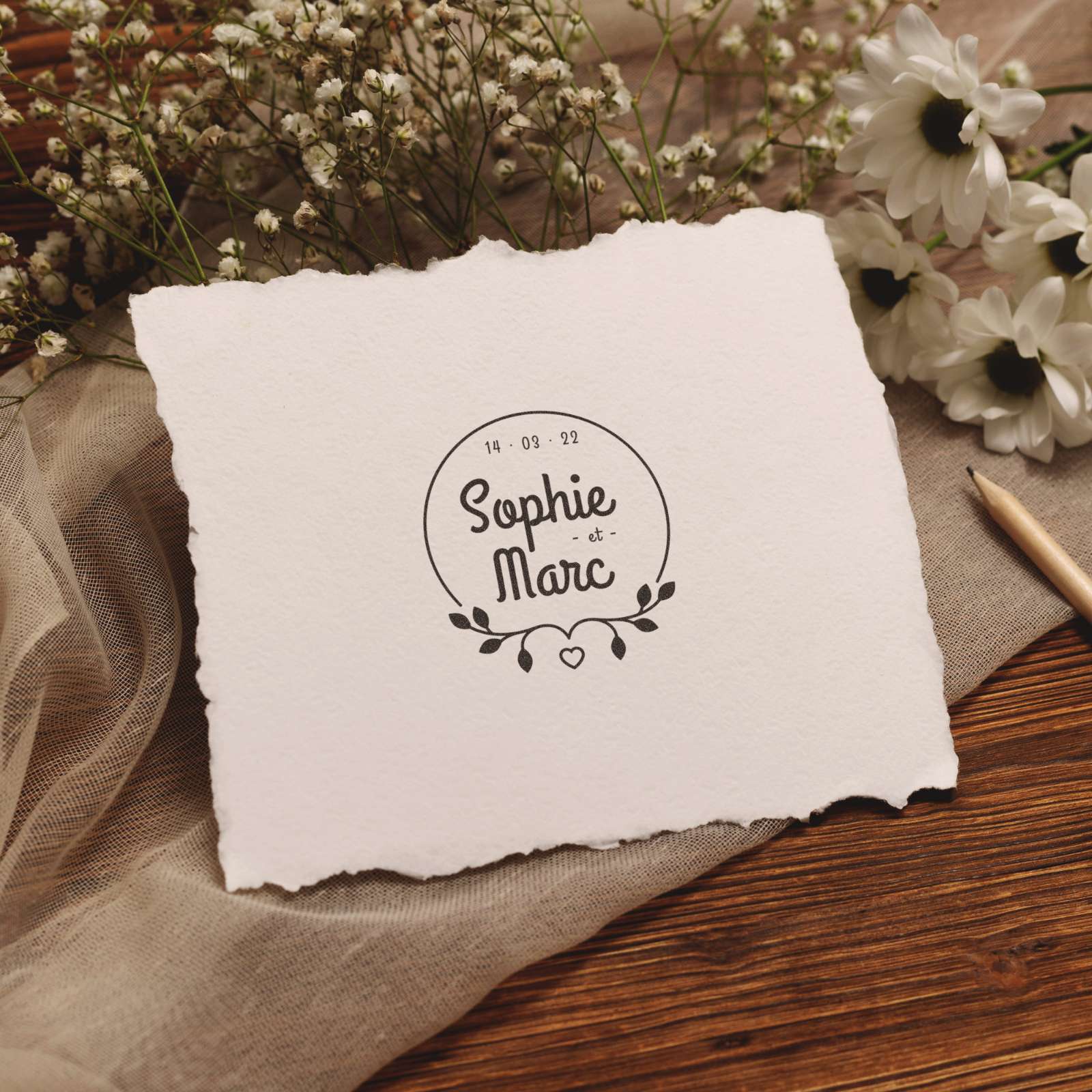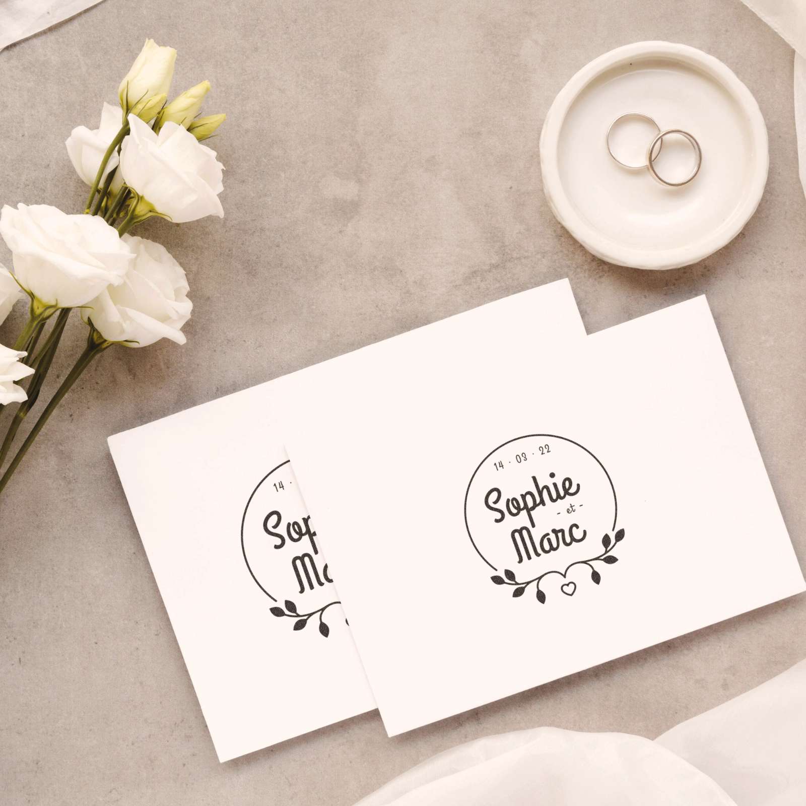 Besiegeln Sie Ihre Verbindung mit Eleganz dank dieses minimalistischen Hochzeitsstempels im raffinierten runden Design, verziert mit einer zarten Girlande aus Laub und einem kleinen symbolischen Herz.