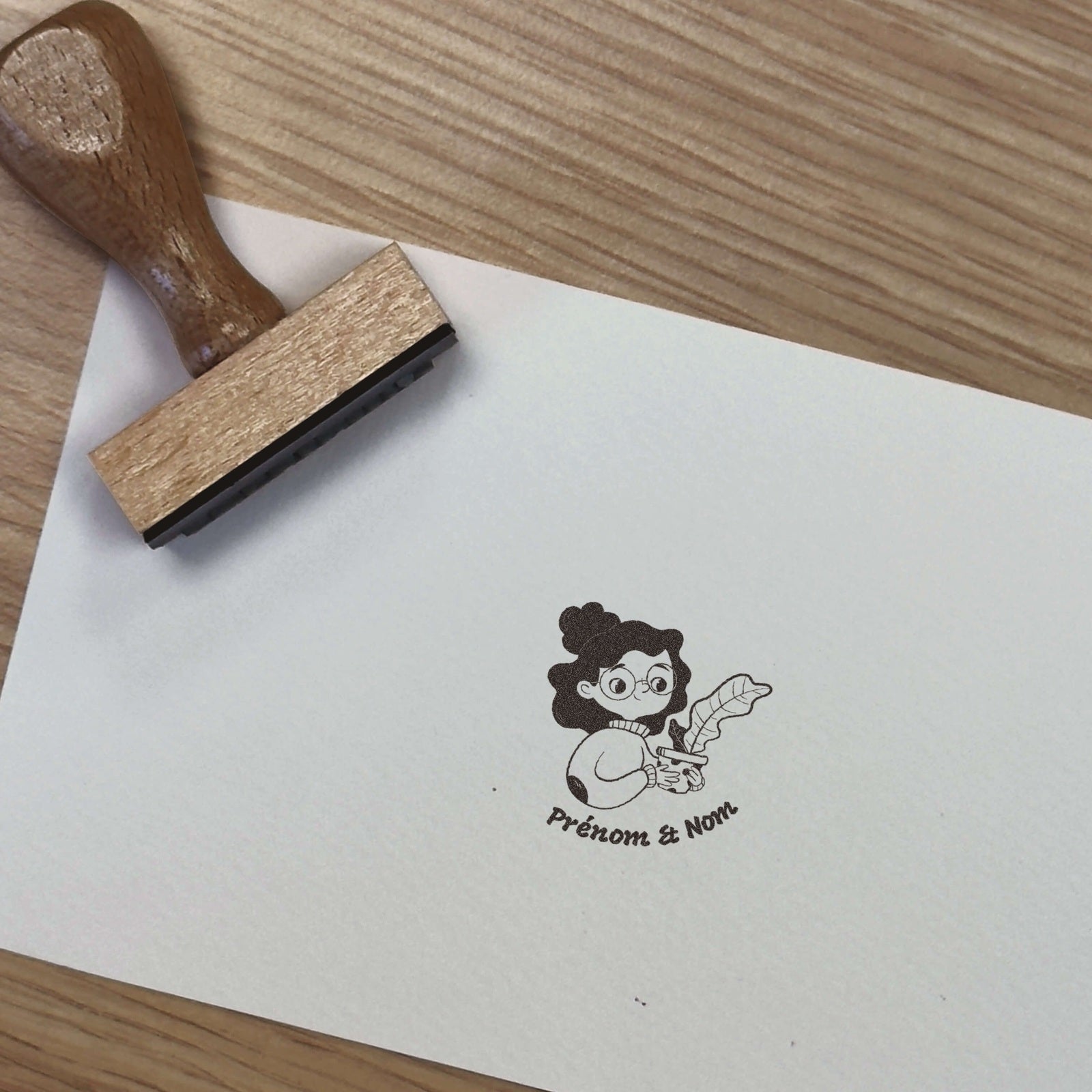 Erstellen Sie Ihr persönliches Exlibris mit diesem charmanten Stempelmodell, das ein Mädchen mit Brille zeigt, das eine Topfpflanze hält.