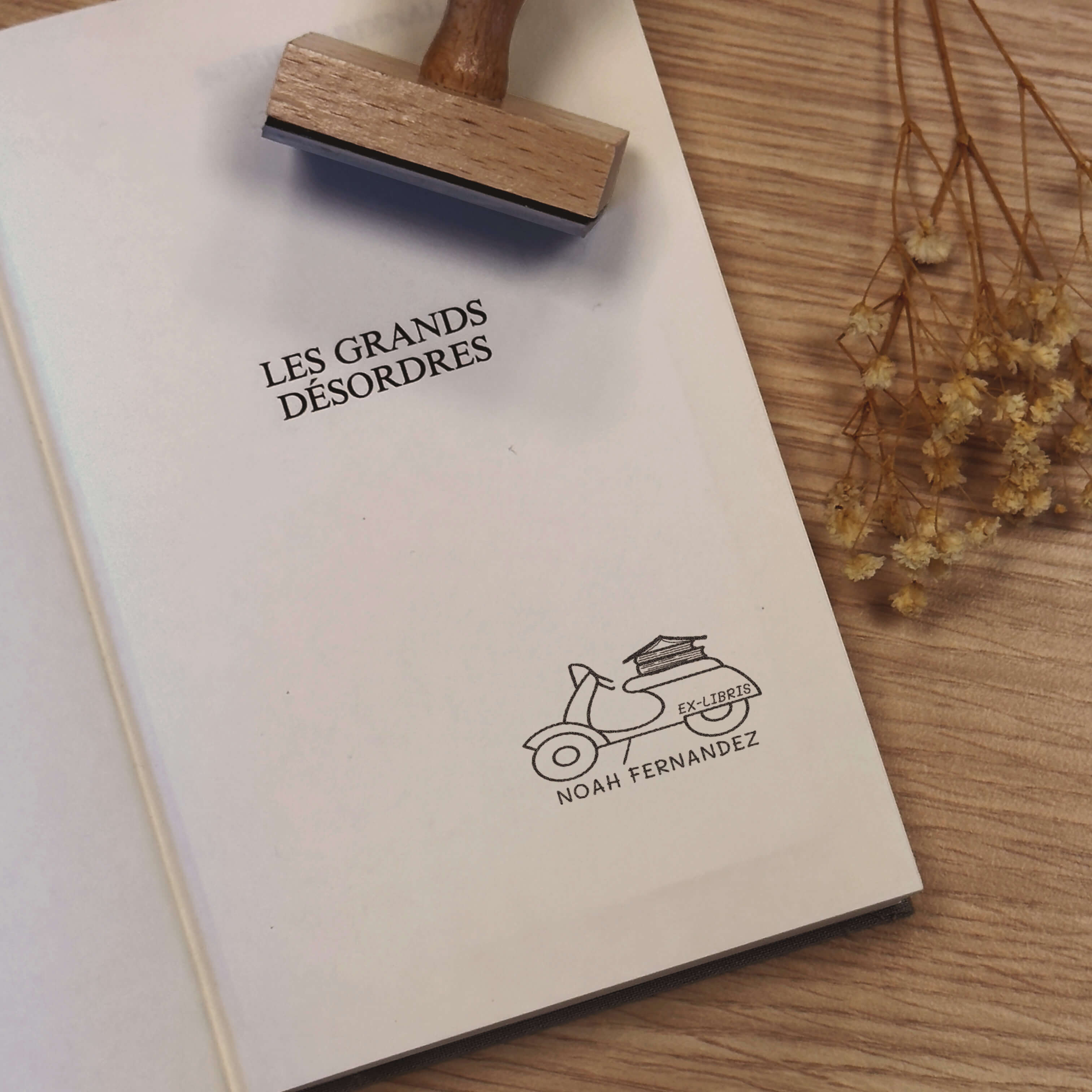 Erstellen Sie Ihre persönliche Signatur mit diesem Vintage-Scooter-Stempel, der Bücher transportiert, perfekt, um Ihre Werke mit einem einzigartigen und originellen Exlibris zu kennzeichnen.